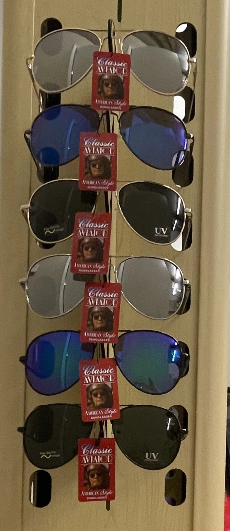 A classic collection of worldwide known Aviator styles, Teardrop shaped lenses in Silver mirror, Color Mirror and classic dark lenses. All with spring temple.